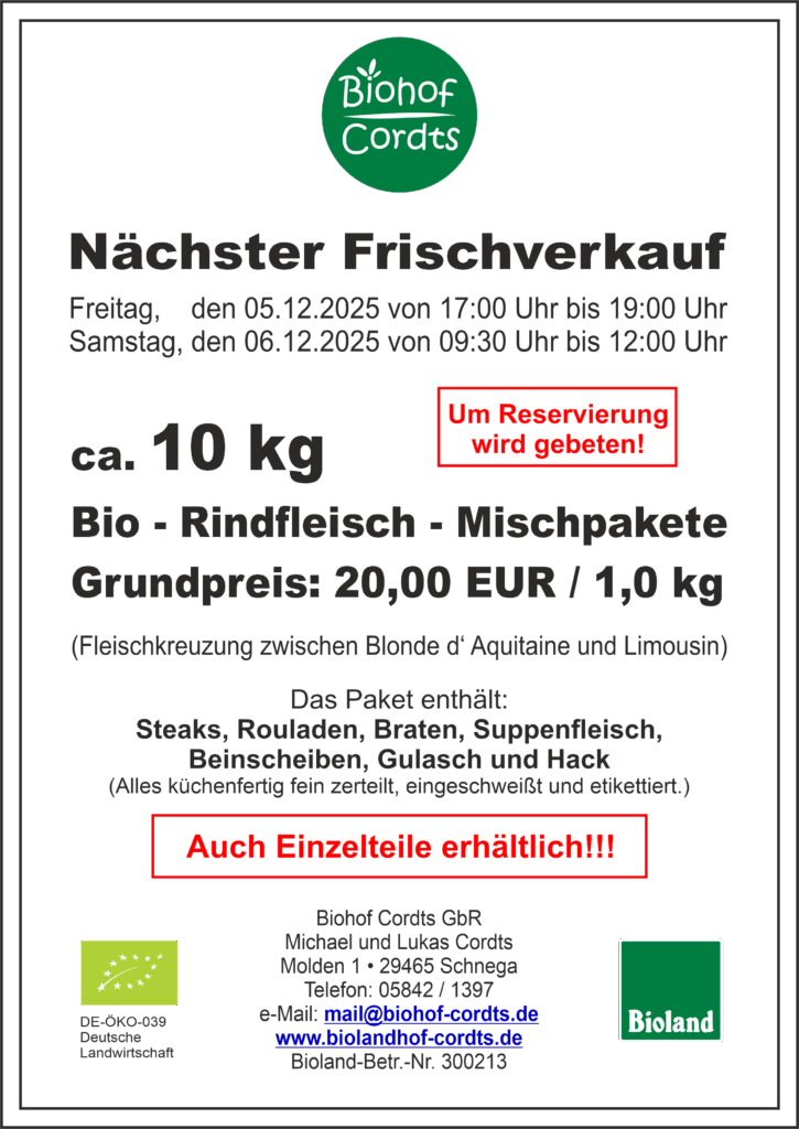 Bestellungen für den nächsten Rindfleischverkauf bitte mit Angabe des Abholdatums.